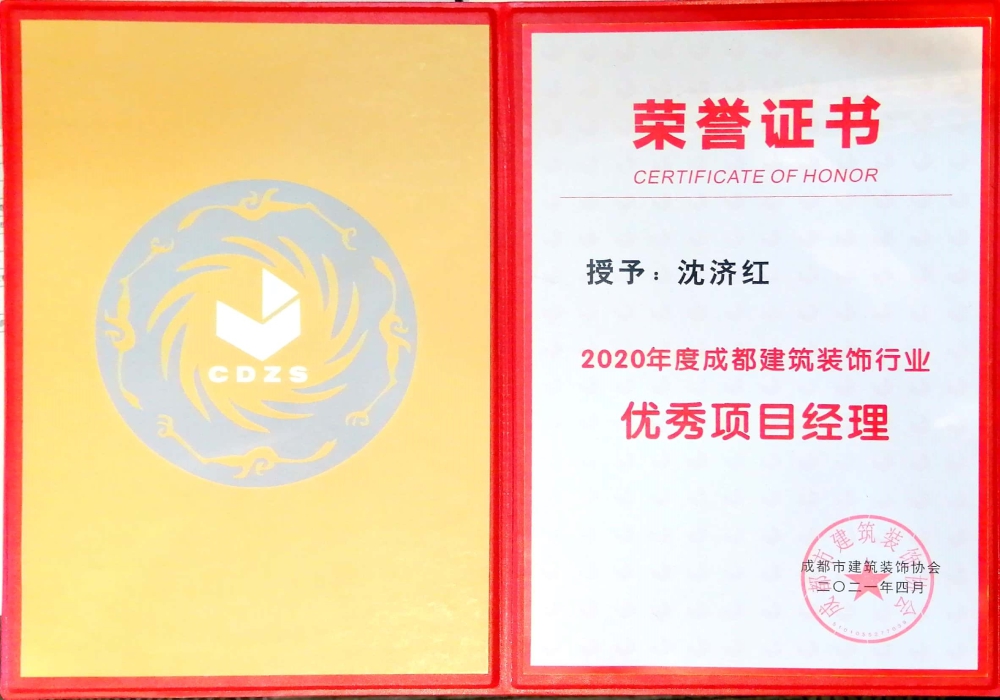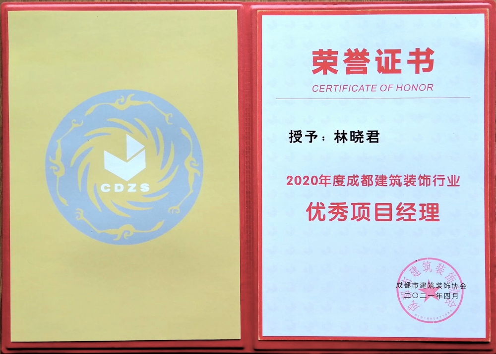 2021年4月,中天精诚装饰荣获成都建筑装饰协会“2020年度成都建筑装饰行业先进企业”荣誉称号。项目经理沈济红、林晓君两人荣获“2020年度成都建筑装饰行业优秀项目经理”称号。