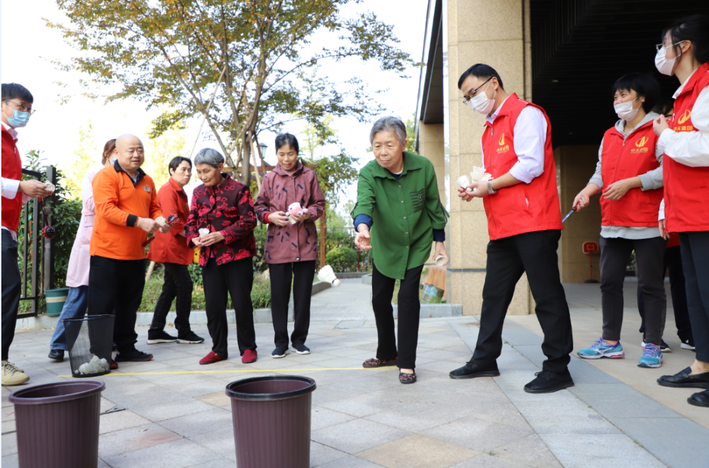 11月1日下午,中天精诚装饰20余名志愿者们再次走进滨江绿康阳光家园,为80名阿尔兹海默症老人精心组织了一场趣味运动会。