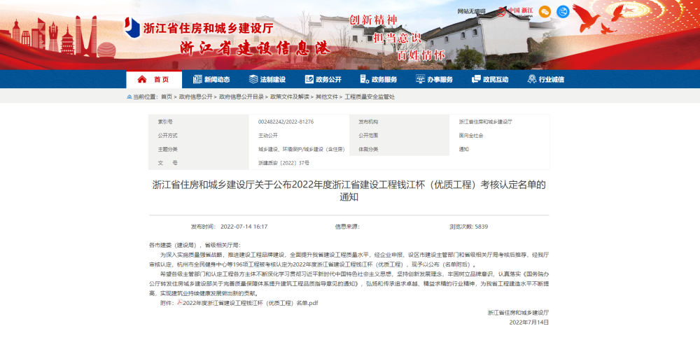 近日,浙江省住房和城乡建设厅发布了《关于公布2022年度浙江省建设工程钱江杯(优质工程)考核认定名单的通知》,196项工程被考核认定为2022年度浙江省建设工程钱江杯(优质工程)。中天精诚装饰参建的浙江医药股份有限公司质检系列车间项目获此荣誉称号。