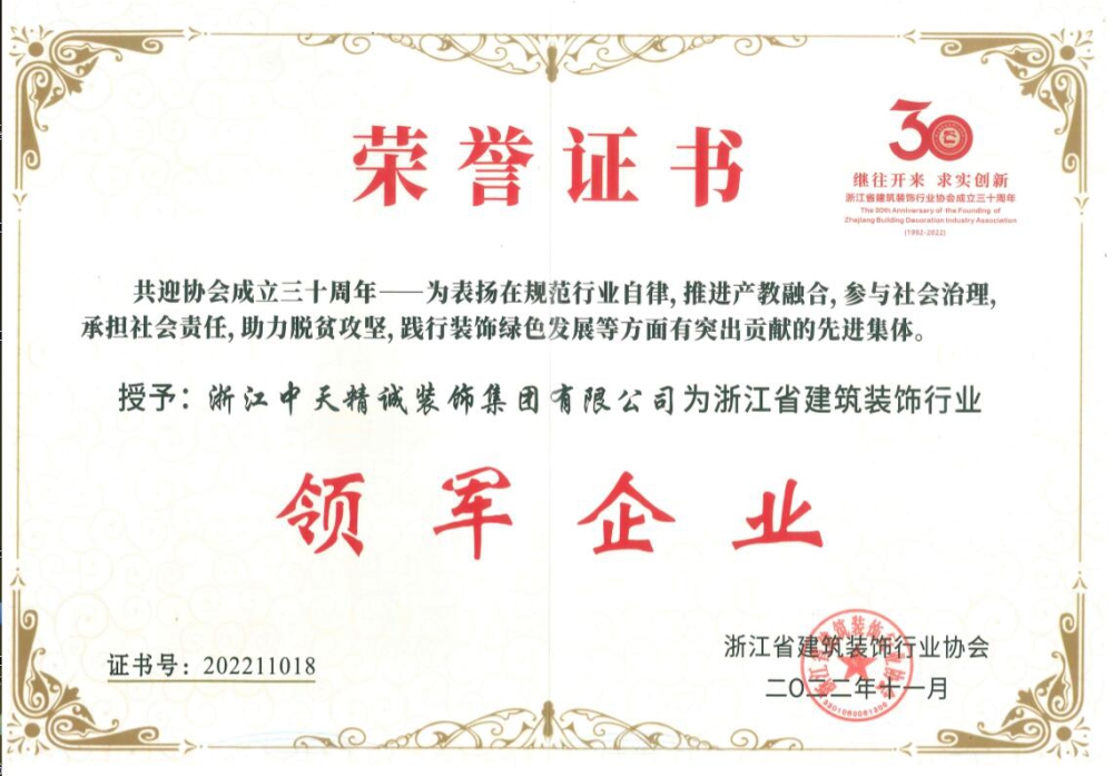 大会对在规范行业自律,推进产教融合,参与社会治理,承担社会责任,助力脱贫攻坚,践行装饰绿色发展等方面有突出贡献的先进集体进行了表彰。中天精诚装饰获“浙江省建筑装饰行业领军企业”称号。随后,大会选举产生了协会第七届理事会成员,中天精诚装饰总经理斯杭东任协会副会长。